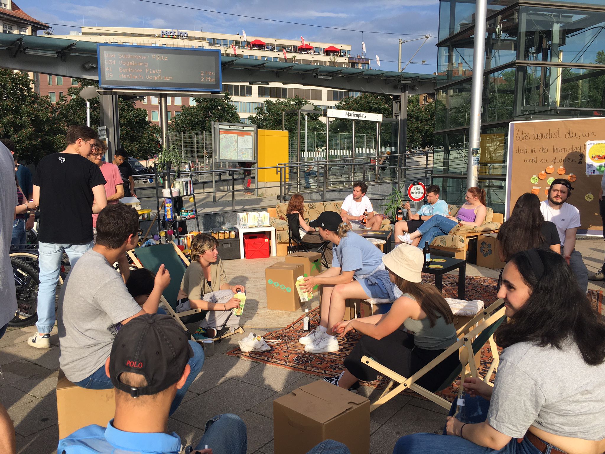 Hierfür wurde ein mobiles „Wohnzimmer“ eingerichtet, das im zweiwöchigen Rhythmus an zentralen und stark frequentierten Orten positioniert wurde. Zu den bespielten Standorten gehörten der Kleine Schlossplatz, der Feuersee sowie der Marienplatz – Plätze, die insbesondere an Wochenenden von vielen jungen Menschen genutzt werden.