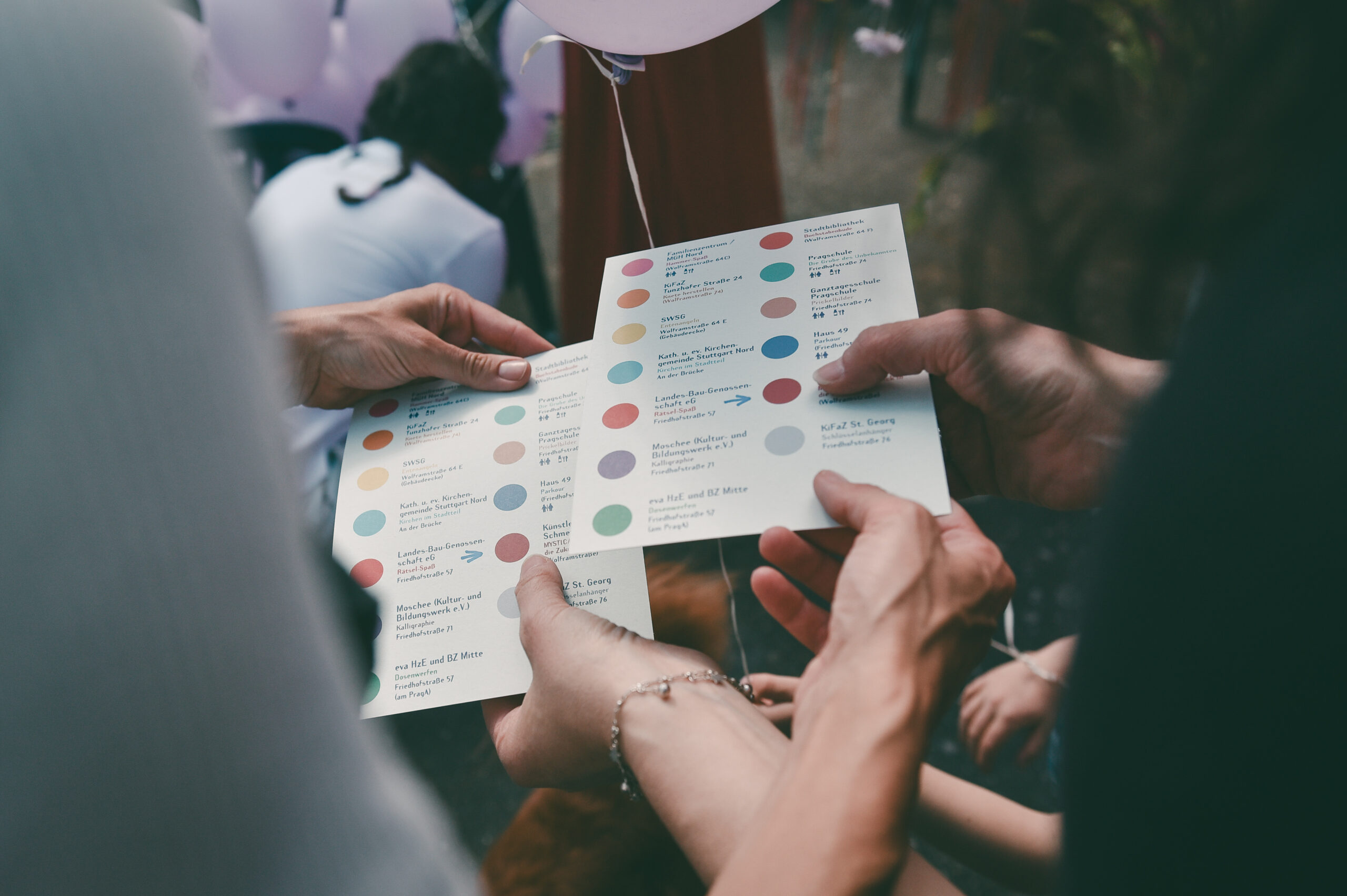 An einem warmen und sonnigen Frühlingsnachmittag verwandelte sich die Wolframstrasse in Stuttgart-Nord in eine lange bunte und funkelnde Bühne für das Coop-Viertel-Straßenfest. Überall gab es bunte Luftballons und Stände mit Spielstationen für junge sowie alte Kinder. Alle Sozialeinrichtungen aus dem Viertel und das Künstler_innen-Kollektiv das Schmetterlingshaus hatten sich zusammengetan, um die Menschen einen Tag lang zu verzaubern und über eine positive Kulturerfahrung und v. a. den Beteiligungsprozess im Vorfeld des Festivals den sozialen Zusammenhalt im Stadtteil zu stärken. Inmitten dieses Spektakels war das Wahrsage-Zelt MYSTICA, mit unzähligen Glitzerpartikeln verziert, die im Licht funkelten. Die drei Wahrsager_innen schenkten den Besucher_innen einen positiven Blick in die Zukunft und verteilten kleine funkelnde Schmetterlinge und Luftballons an die Kinder. Schräg gegenüber war der Stand des SWSG, der über das neue Wohnungsangebot in ihrem Viertel informierte und dazu einlud, sich einen neuen Namen für das Areal des ehemaligen Bürgerhospitals auszudenken, dort entsteht gerade ein neuer Stadtteil. Kulinarische Stände boten Waffeln und Pizza zum Selbermachen an, die Kinder bastelten Schlüsselanhänger oder stellten Knete selbst her und der Mobifant rückte mit Spielgeräten an. Es war ein Erlebnis, das die Sinne verzauberte und die Menschen aus dem Alltag entführte.