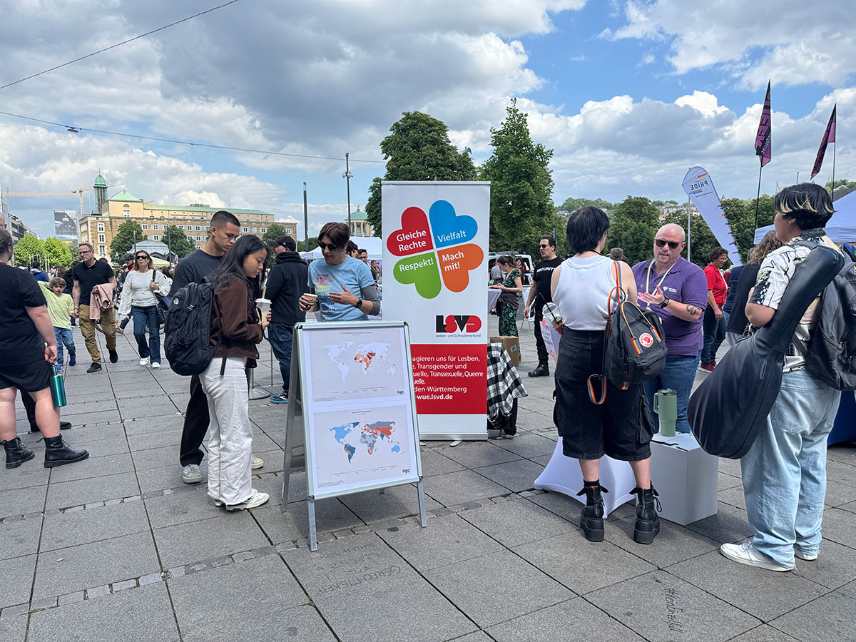 „Wir sind über die ILGA Rainbow Map mit vielen Leuten ins Gespräch gekommen, über den Stand von Queerfeindlichkeit in Europa und der Welt sowie über „unser“ Thema Regenbogenfamilien und fehlende Reform des Abstammungsrechts und drittens ein paar Mal als Beratung zum Thema Diversity Management in Unternehmen – das hatte sich so ergeben, passte aber.“ LSVD+ BaWü